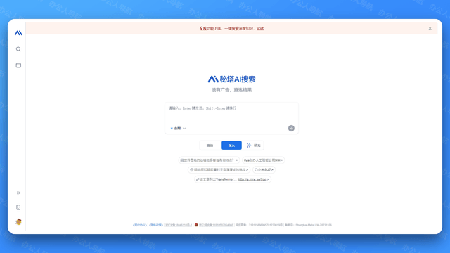 秘塔AI搜刮由上海秘塔科技推出,设想简练,确保多样化的搜刮能力和高效的响应。它通过深切阐发用户的搜刮企图,次要用于帮帮用户快速阐发和处置大量非布局化数据,可以或许快速理解用户的查询企图。